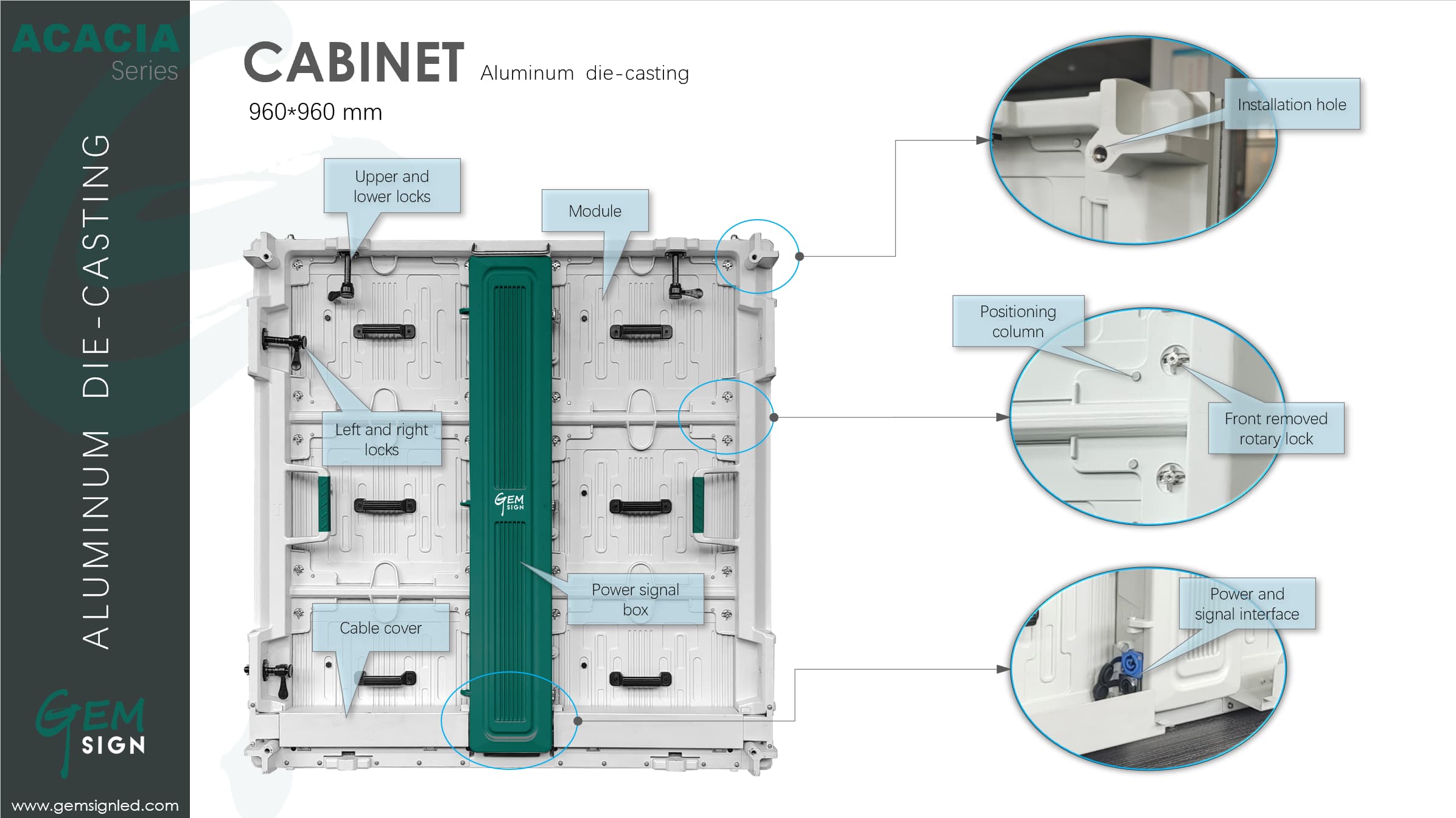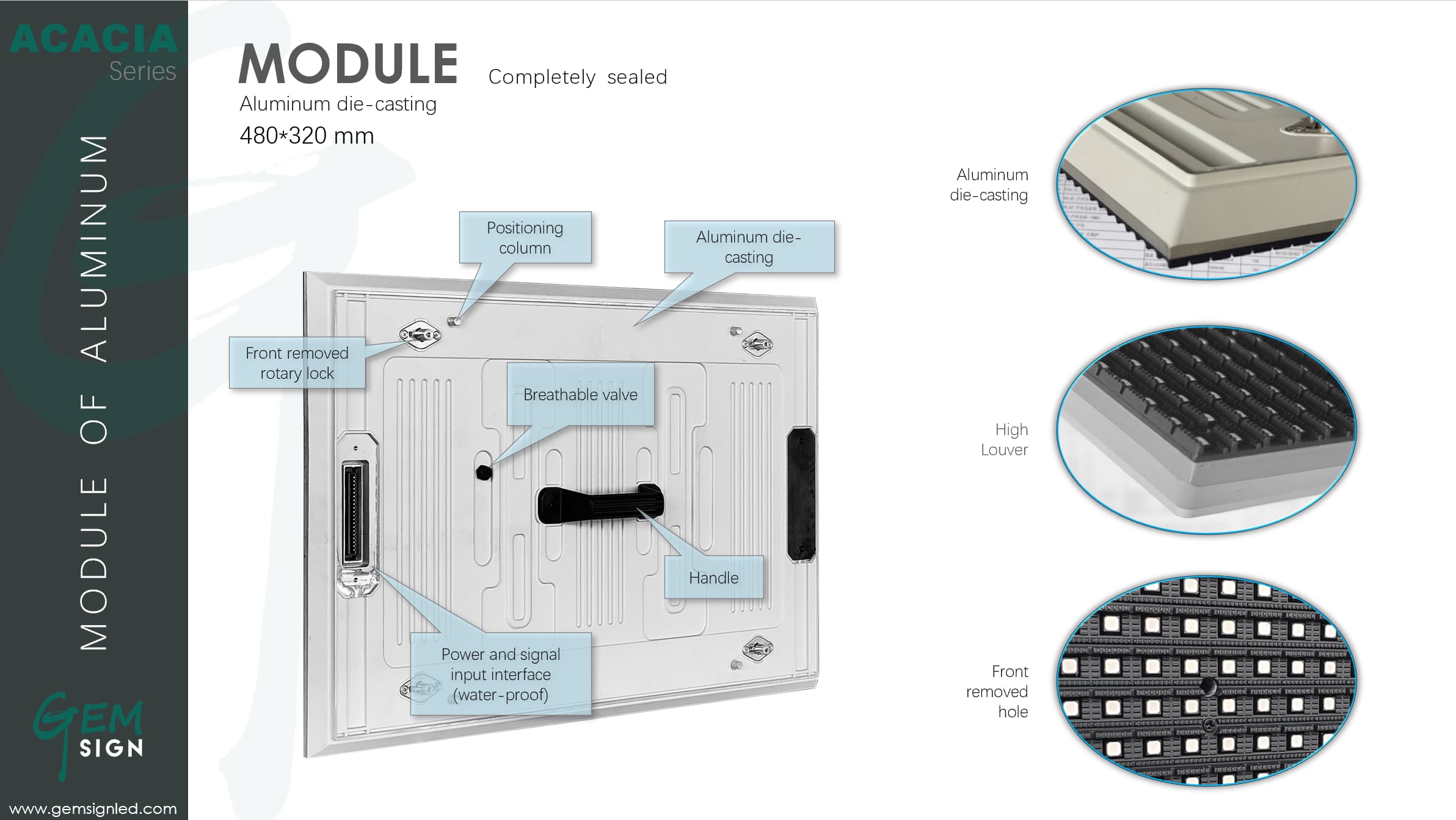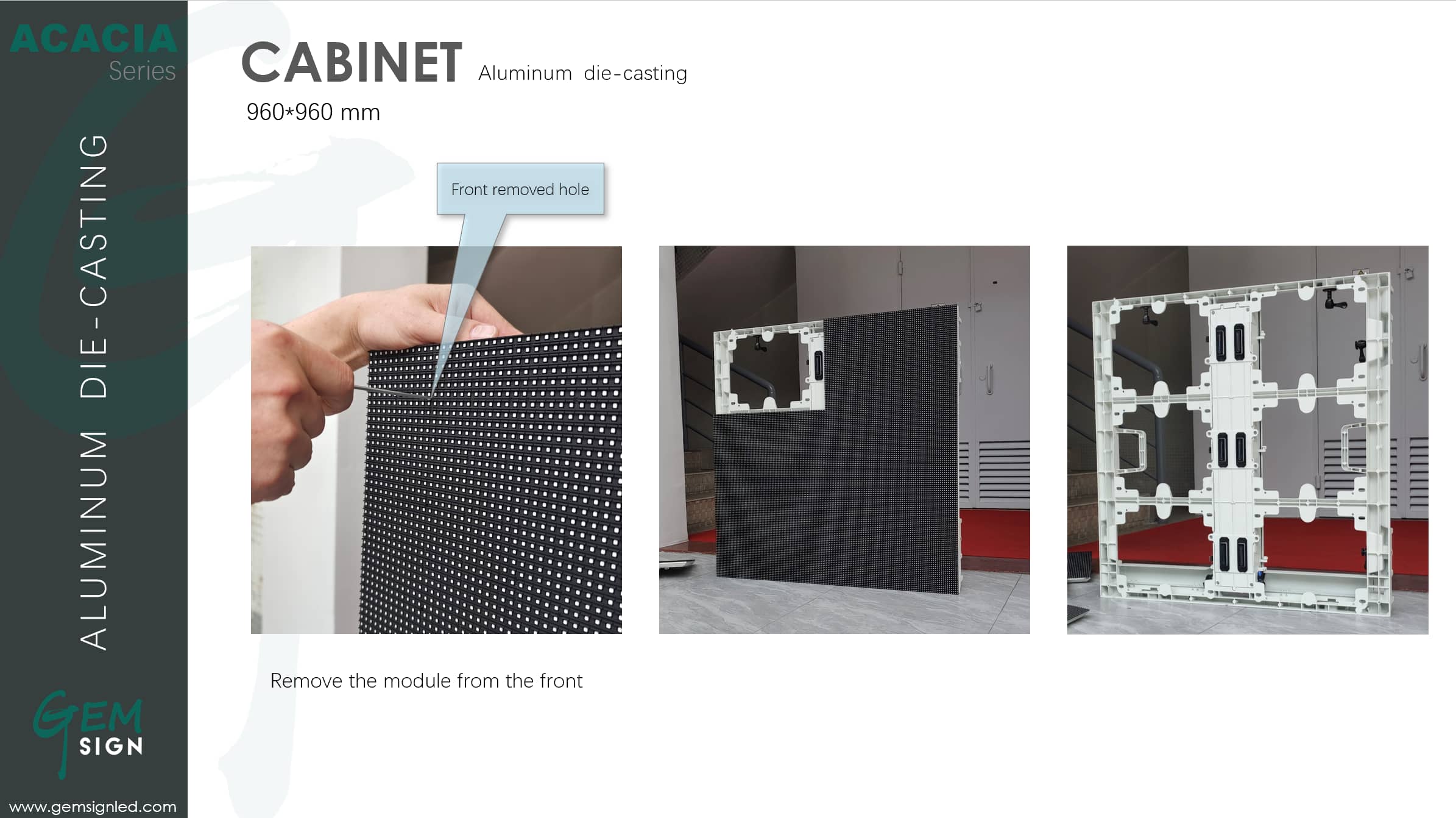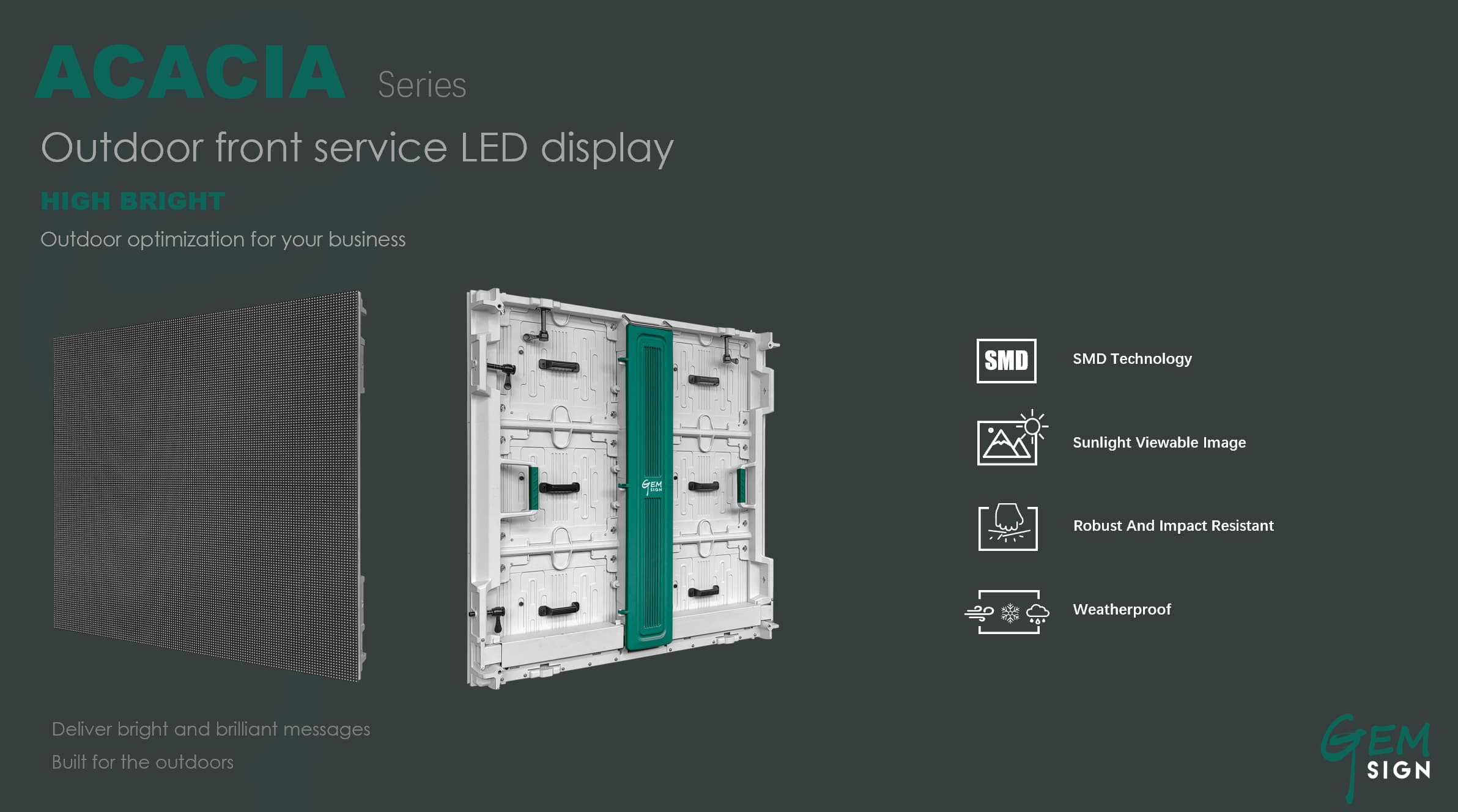 IP66 front / IP66 rearGemsign’s Acacia series is designed for fixed outdoor use which is an outdoor front service LED display with very high brightness from 6000nits to 10000nit, pixel pitch ranges from 4mm to 10mm. This series almost meets all the requirements for outdoor fixed display, and the brightness can even reach 10000nit according to the needs of customers. It provides high-definition image quality and is convenient to maintain.