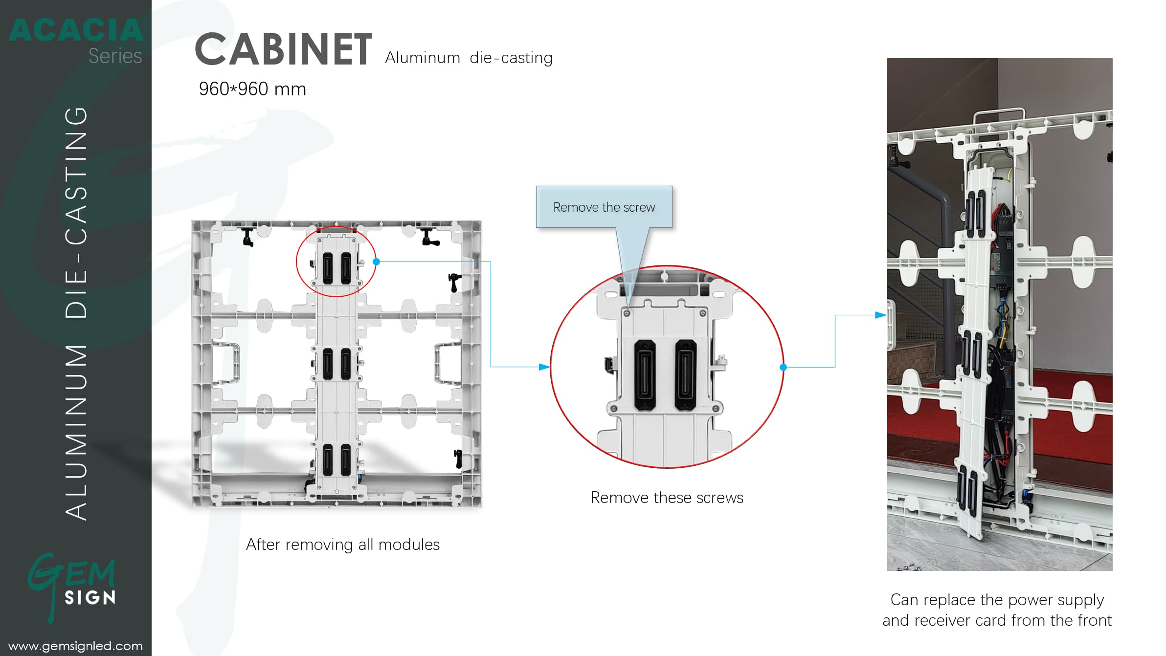 Gemsign’s Acacia series is designed for fixed outdoor use which is an outdoor front service LED display with very high brightness from 6000nits to 10000nit, pixel pitch ranges from 4mm to 10mm. This series almost meets all the requirements for outdoor fixed display, and the brightness can even reach 10000nit according to the needs of customers. It provides high-definition image quality and is convenient to maintain.